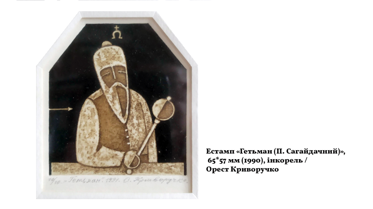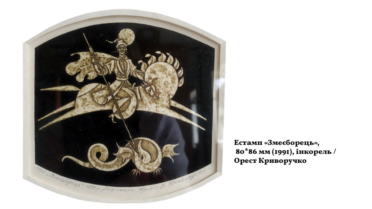 Естампи «Гетьман (П. Сагайдачний)» (1991), «Змієборець» (1991), були присвячені Орестом Криворучко 500-річчю українського козацтва і 375-річчу Хотинської битви. Експонувалися на Міжнародній виставці естампу в Японії (Канагава 1992 р.).