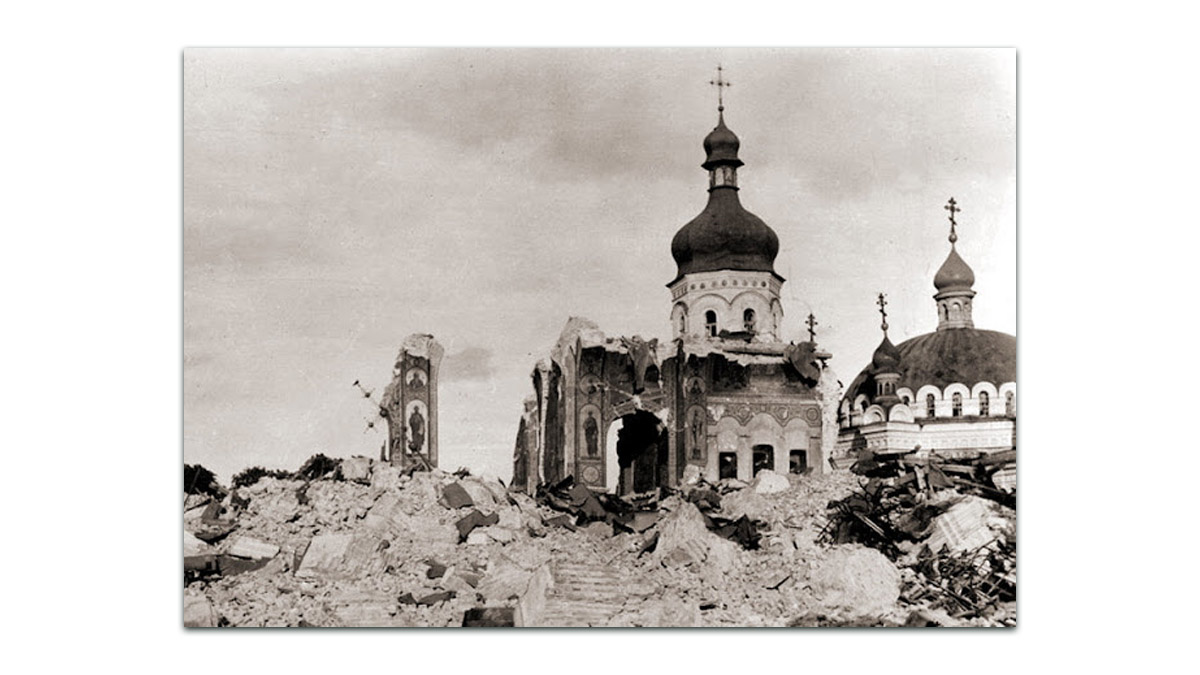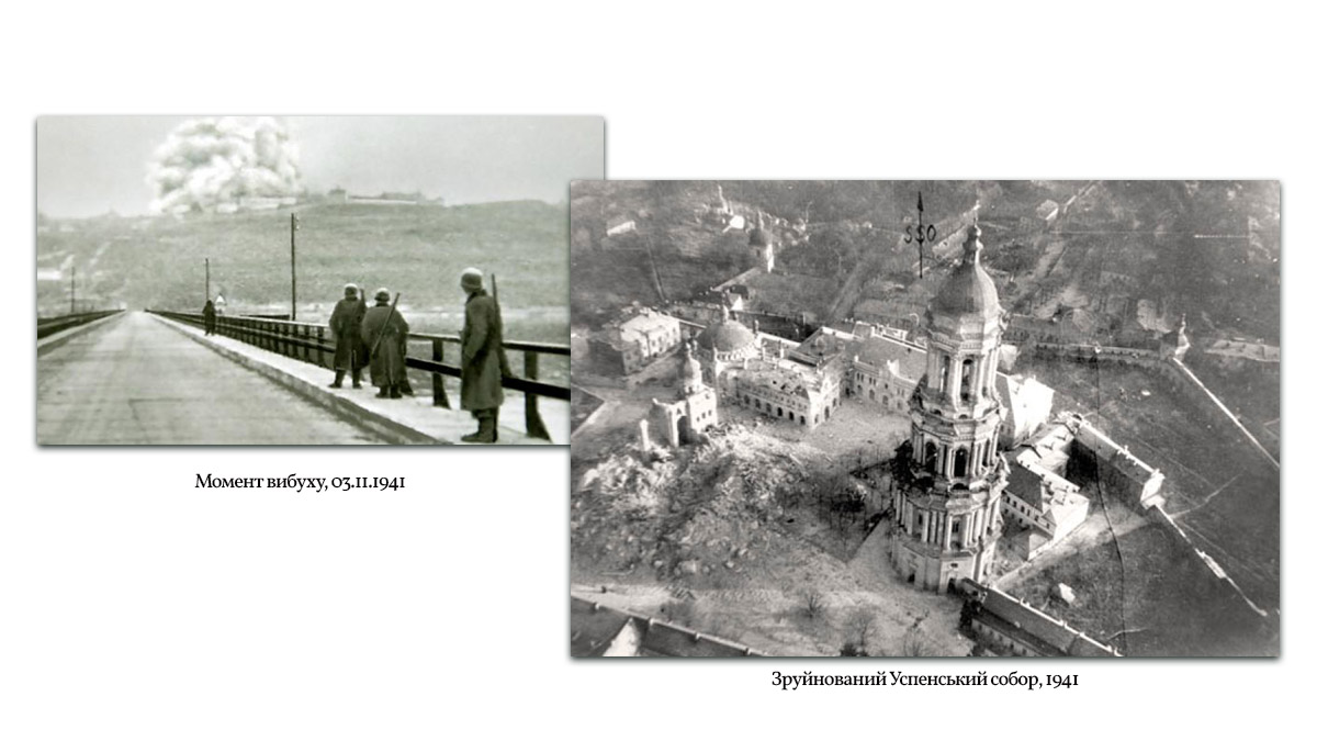 «Головний храм монастиря – Успенський собор, зведений в XI столітті, злетів у повітря 3 листопада 1941 року.