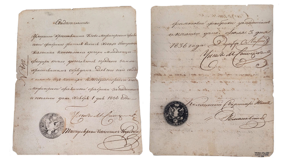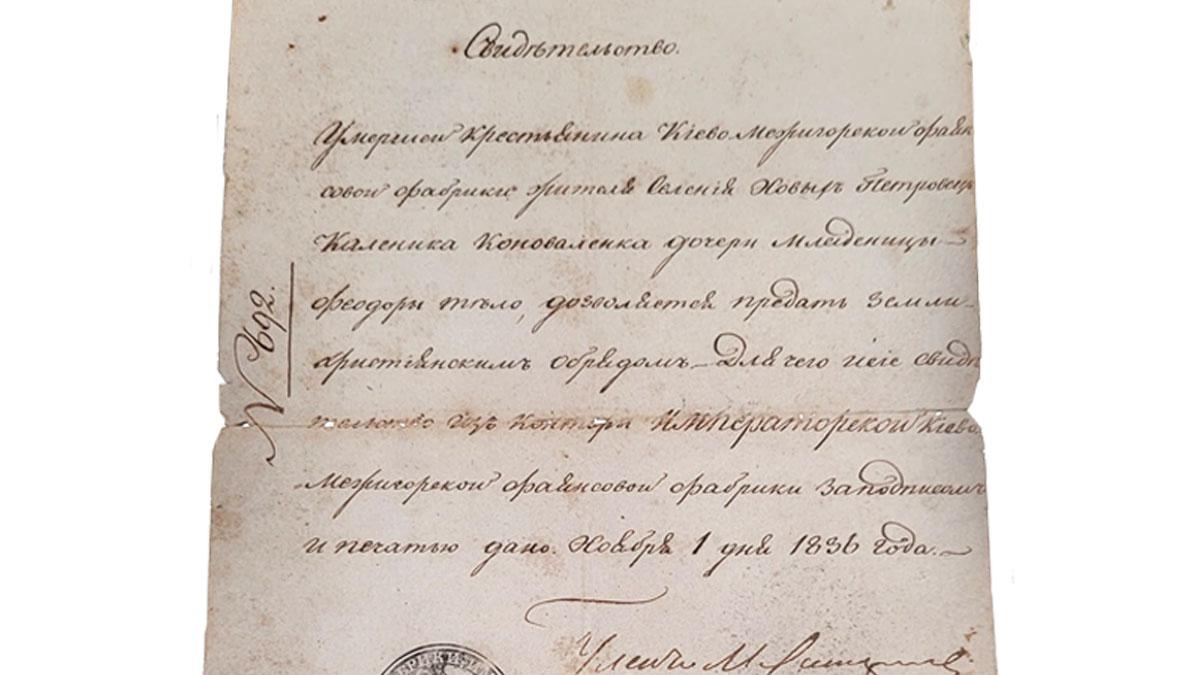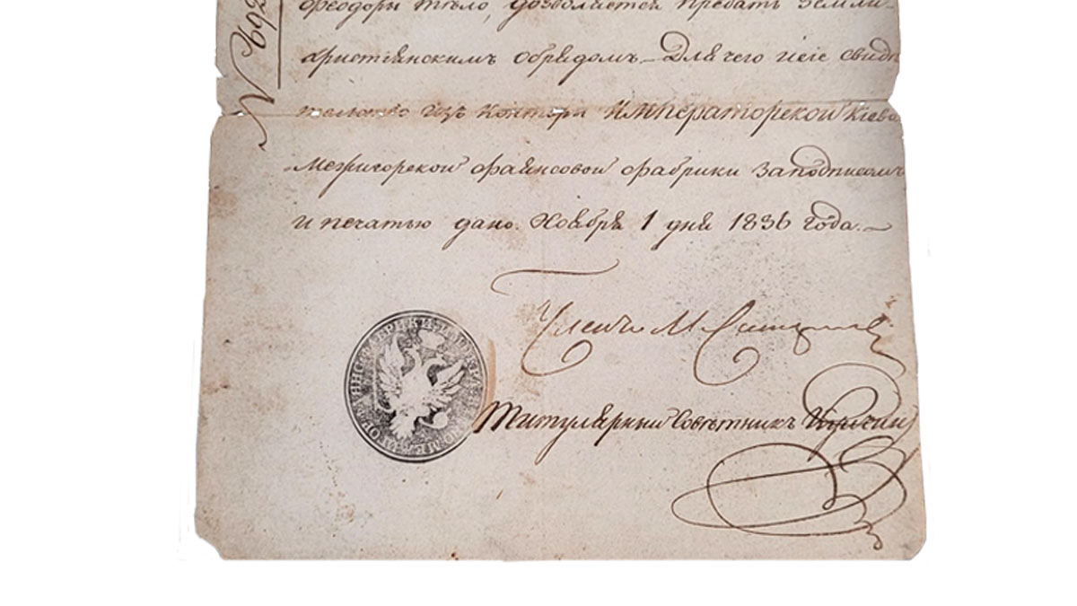 В фондах музею зберігається цікавий та рідкісний документ – Свідоцтво №682 від 01.11.1836 року – яке є «Дозвілом на поховання».
