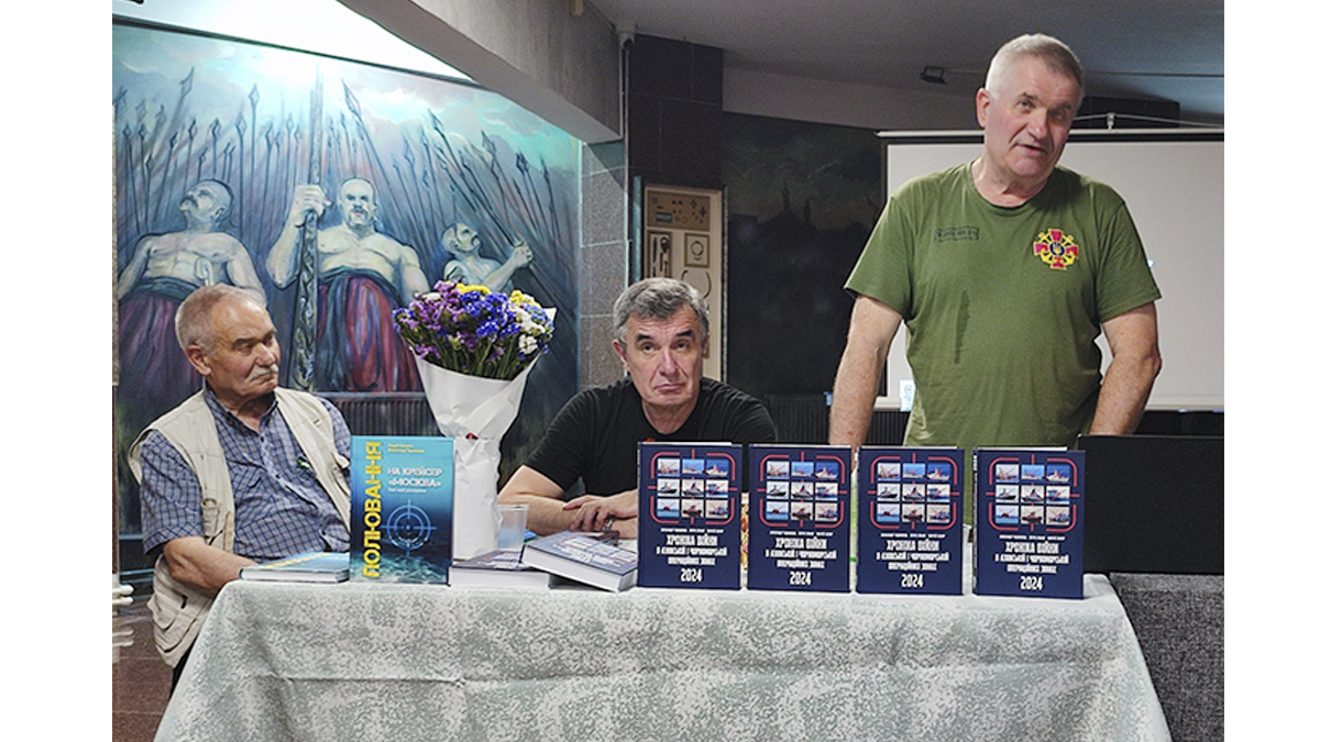 До музею завітали автори видання — Олександр Чудновець, Георгій Снігир та Петро Сенько, науковий співробітник нашого музею. Вони поділилися тим, як збиралася інформація, як фіксувалися морські операції, атаки дронів і знищення ворожих кораблів протягом 2024 року.